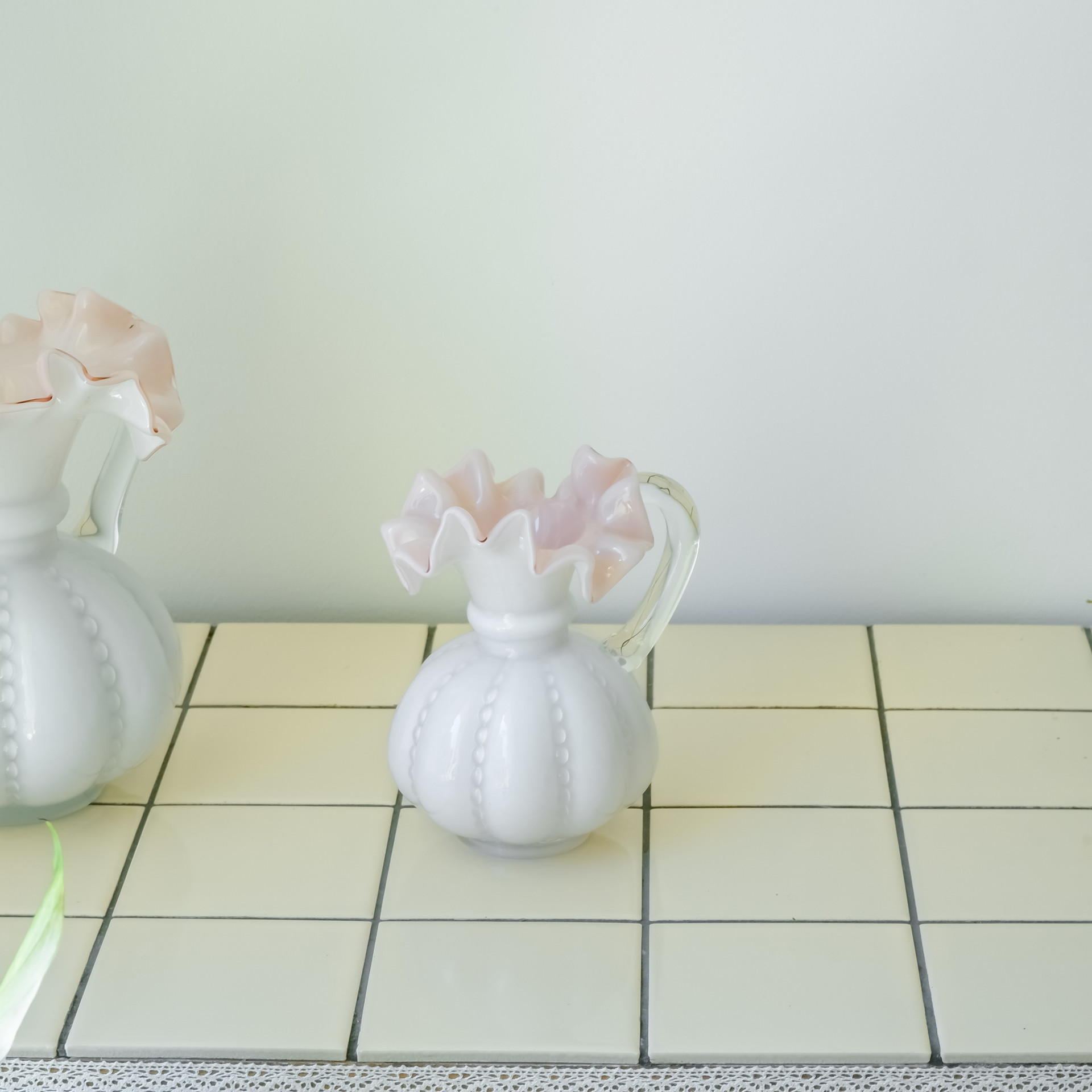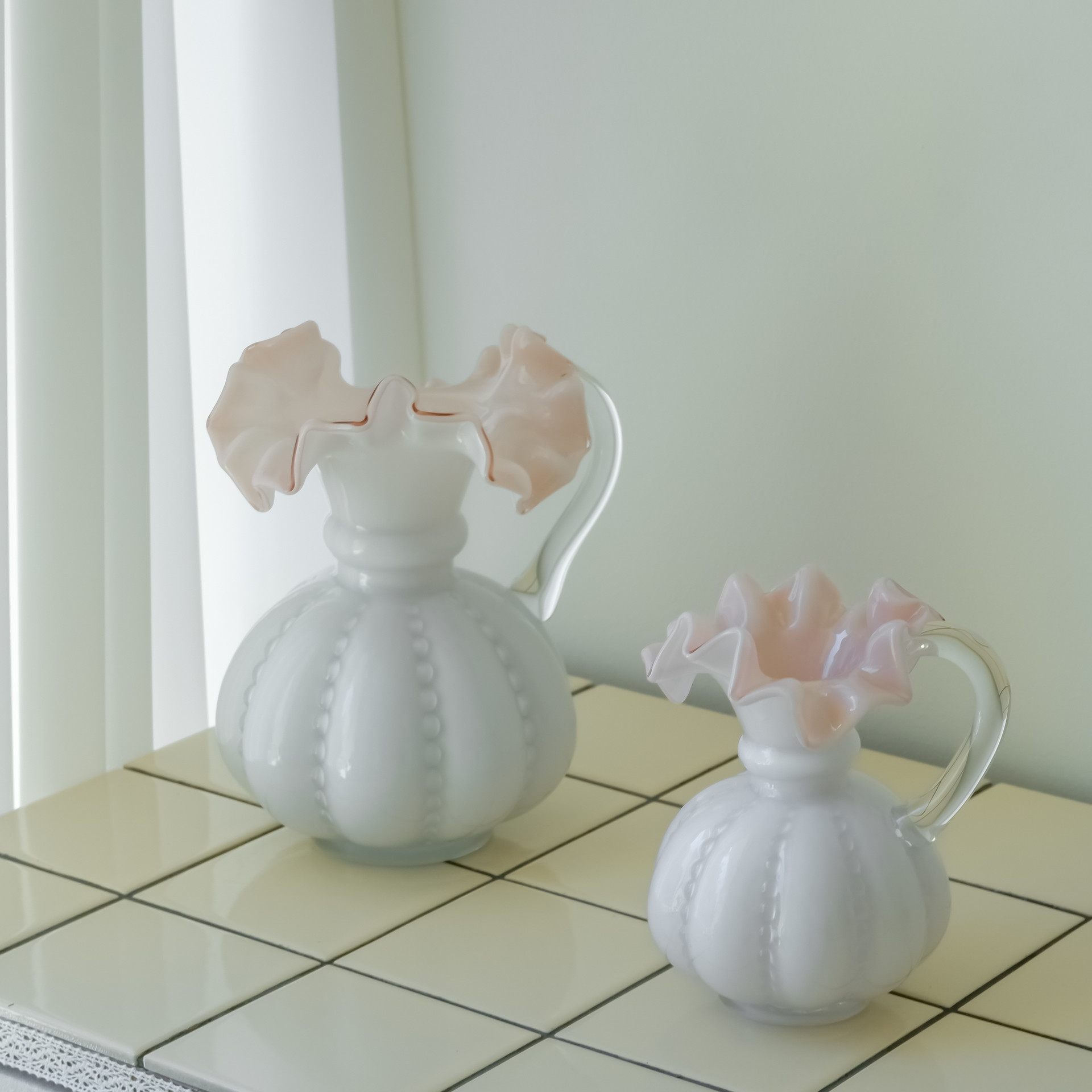 화이트와 핑크 플리츠의 조합이 어여쁜 파스텔 컬러의 유리소재 고급 화병입니다. 파스텔 톤의 컬러와 유리 특유의 맑은 투명함이 더해져 청초한 분위기를 조성합니다. 화병의 입구가 좁아, 줄기가 얇은 3-5송이의 꽃을 꽂기에 적합합니다. 묵직한 무게감을 가졌으며, 유광의 표면을 가지고 있습니다. 사이즈는 아래 설명을 참고해주세요.